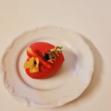 Silts ābolu biezeņa deserts ar Rīgas melnā balzāma saldējumu, bezē un šokolādes drupačām