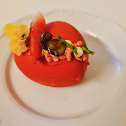 Tomātu- cukini kārtojums ar fetas sieru, kvinoja, lakšu pesto mērce