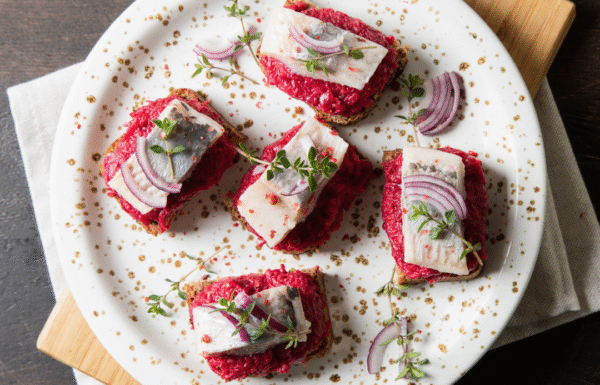 Kanapē ar kazas sieru un bietēm