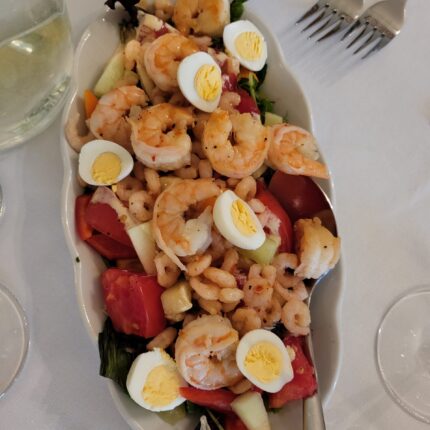 Zaļie lapu salāti ar garnelēm, mango, zemenēm, zilo sieru un čilli mērci 18.00 eur/kg