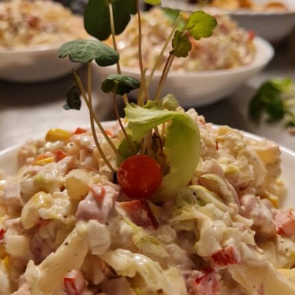 Vistas-ananāsu salāti ar jogurta-karija mērci Sastāvs: Kūpināta vistas gaļa, ķīnas kāposts, paprika,kukurūza, ananāsi, jogurts, karijs. 12.00 eur/kg