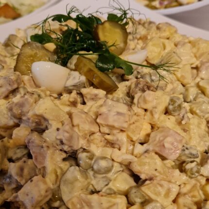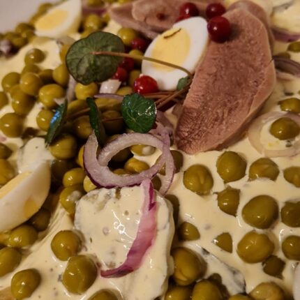 Cepeša salāti ( kā rasols tikai ar cepeša gaļu) Sastāvs: Cepeša gaļa, kartupeļi, burkāni, zaļie zirņi, ola, majonēze, sinepes, marinēti