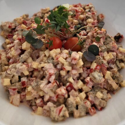 Pikantie ķiploku grauzdiņu salāti. Iespējams pasūtīt arī veģetārus. 18.00 eur/ kg