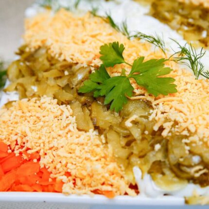 Ceptu aknu salāti ar sīpoliem un marinētiem gurķiem